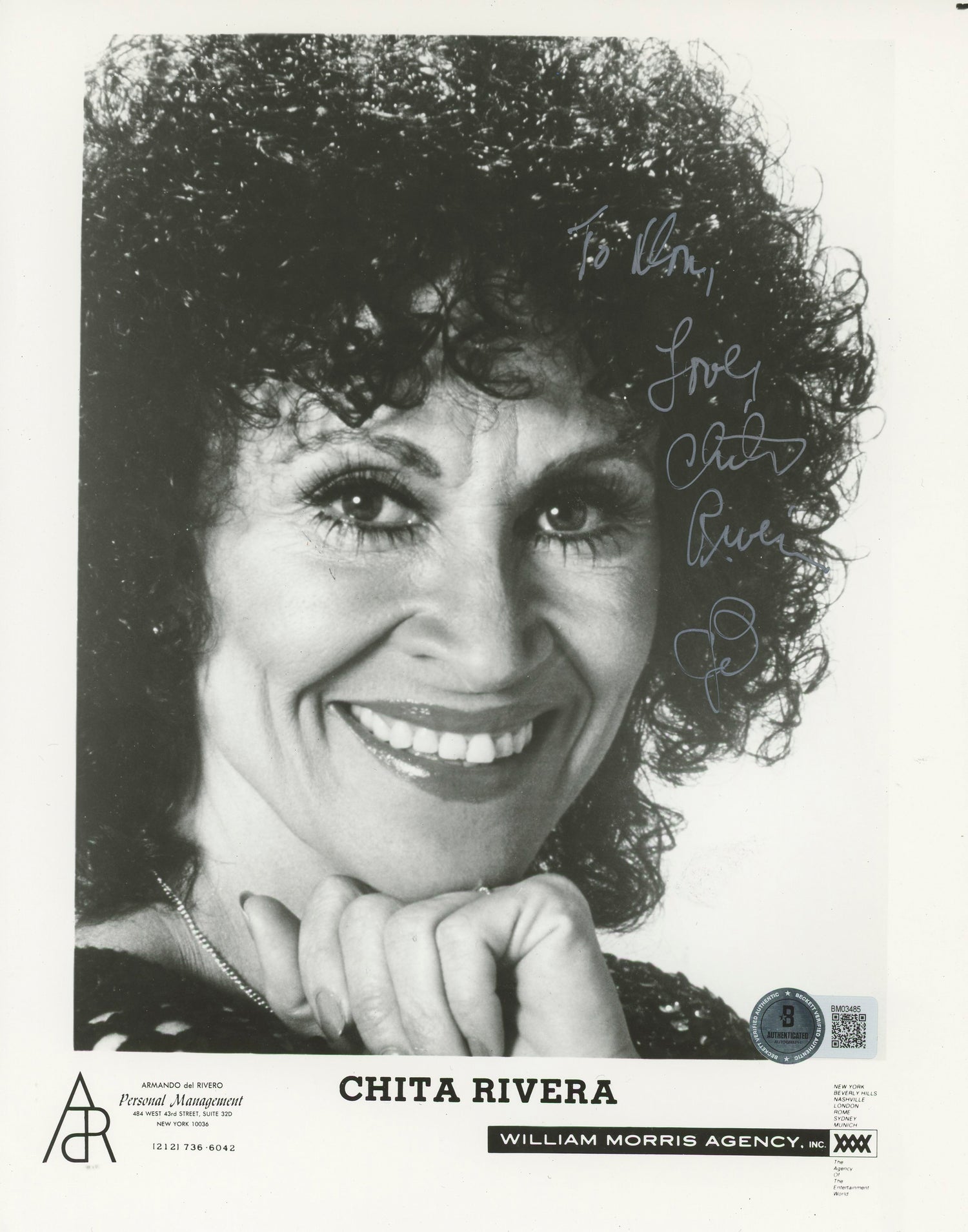 Own a piece of Broadway history with this Chita Rivera Autographed 8x10 Photo, featuring the inscription "Love". Chita Rivera, a legendary actress, singer, and dancer, is best known for her iconic role in Chicago, making this signed photo a must-have for theater enthusiasts and collectors alike. This item is 100% authentic, certified by Beckett Authentication Services (BAS).