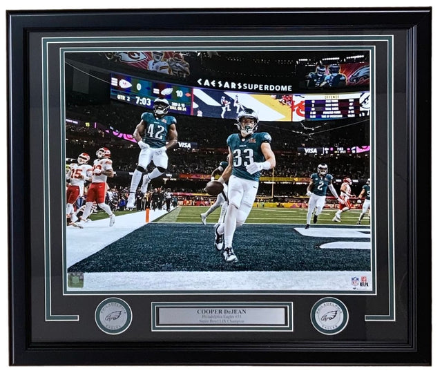Own a piece of football history with this Cooper DeJean 16x20 Philadelphia Eagles Super Bowl 59 framed photo. Perfect for devoted Eagles fans and memorabilia collectors, this professionally framed and matted display is a must-have for any collection.