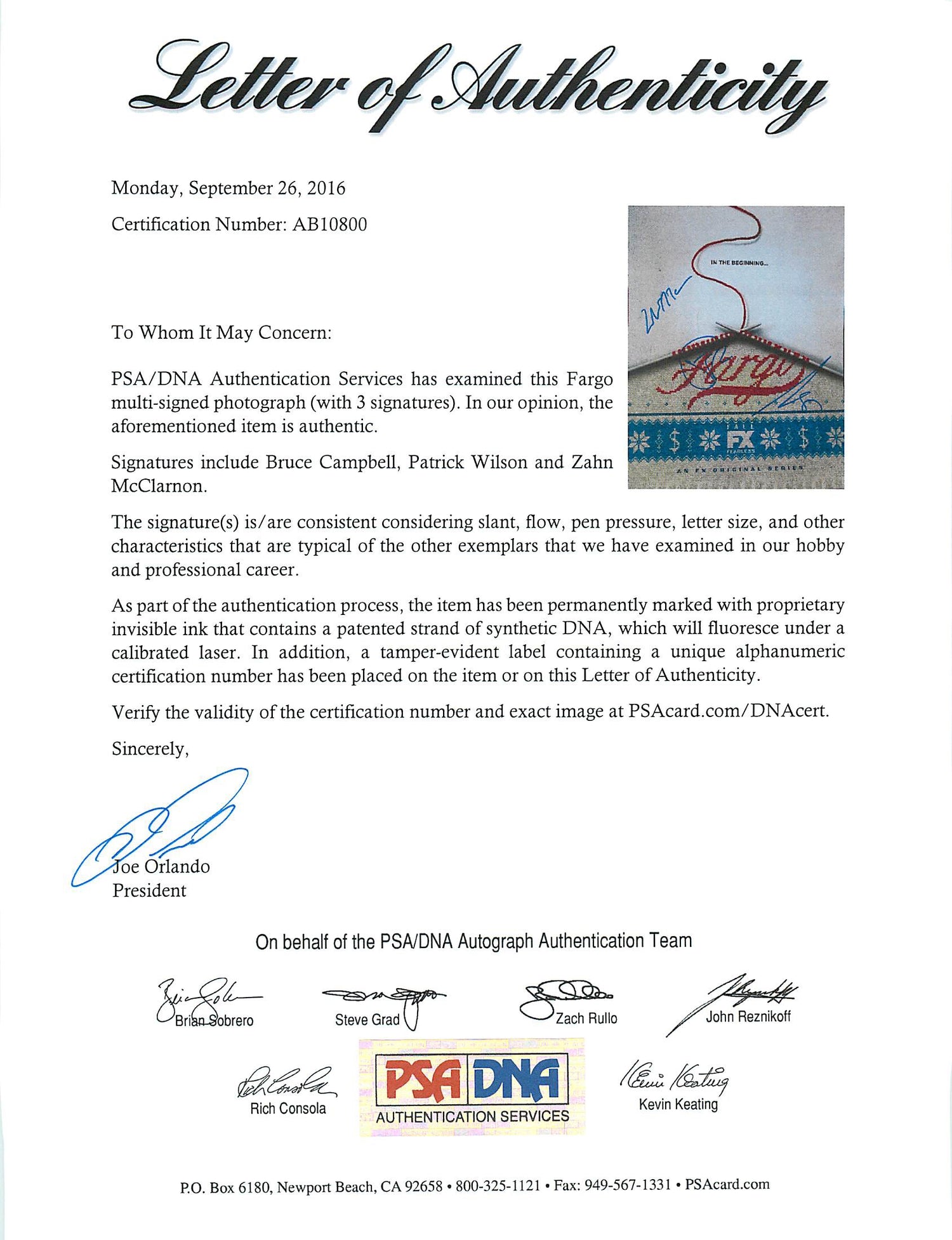 Fargo (Patrick Wilson, Bruce Campbell, +1) Signed 11X14 Photo PSA/DNA #AB10800