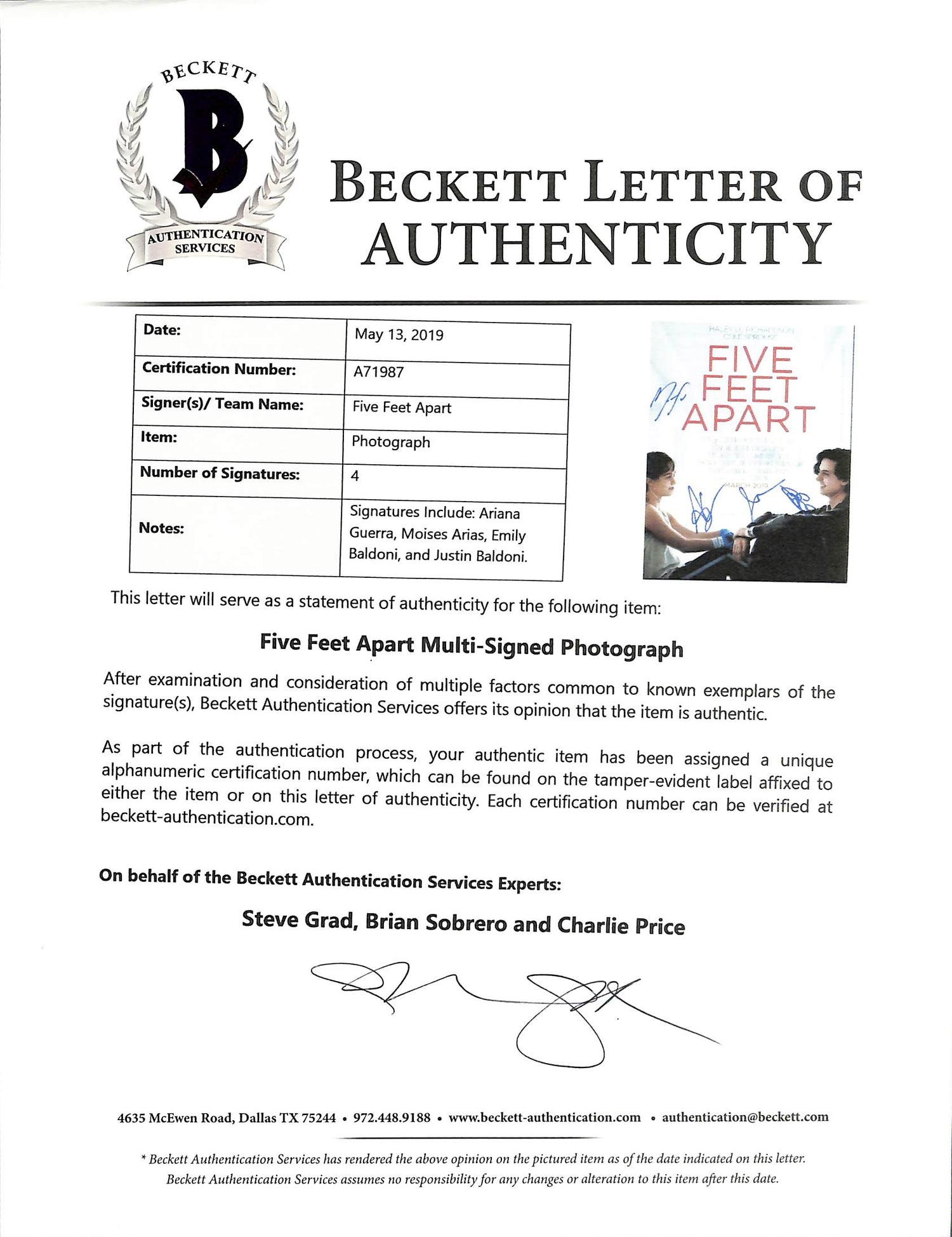 This Autographed 11x14 Photo has been personally signed by Ariana Guerra, Moises Arias, Justin Baldoni, and Emily Baldoni from the critically acclaimed film *Five Feet Apart*. A must-have collectible for fans of the movie, this signed memorabilia is the perfect way to commemorate the heartfelt story and talented cast. This item is 100% Authentic, backed by a Certificate of Authenticity (COA) and a tamper-proof hologram from Beckett Authentication Services. Verification can be done directly on the Beckett Authentication Services website, ensuring the legitimacy of this unique piece. Press Pass Collectibles guarantees authenticity with: