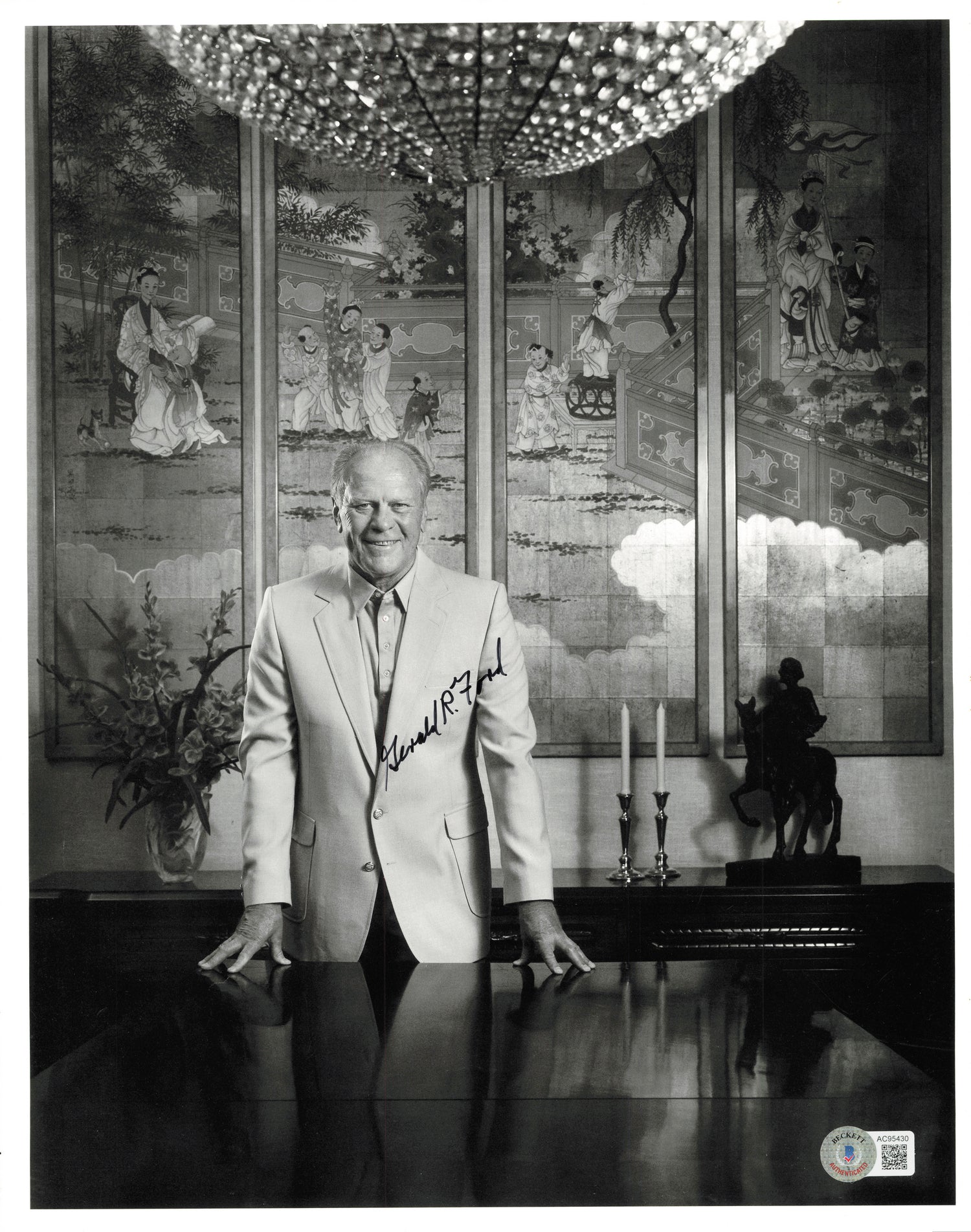 Own a rare piece of American history with this 11x14 photo autographed by Gerald Ford, the 38th President of the United States. This striking image, personally hand-signed by President Ford, adds both presidential prestige and collectible value to any memorabilia collection. Whether you're a seasoned political memorabilia collector or a history enthusiast, this item makes a compelling and conversation-worthy display.