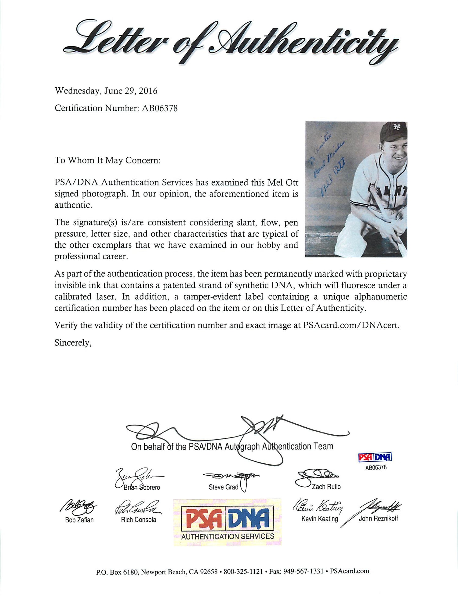 - Authentic Autograph – Personally hand-signed by Mel Ott