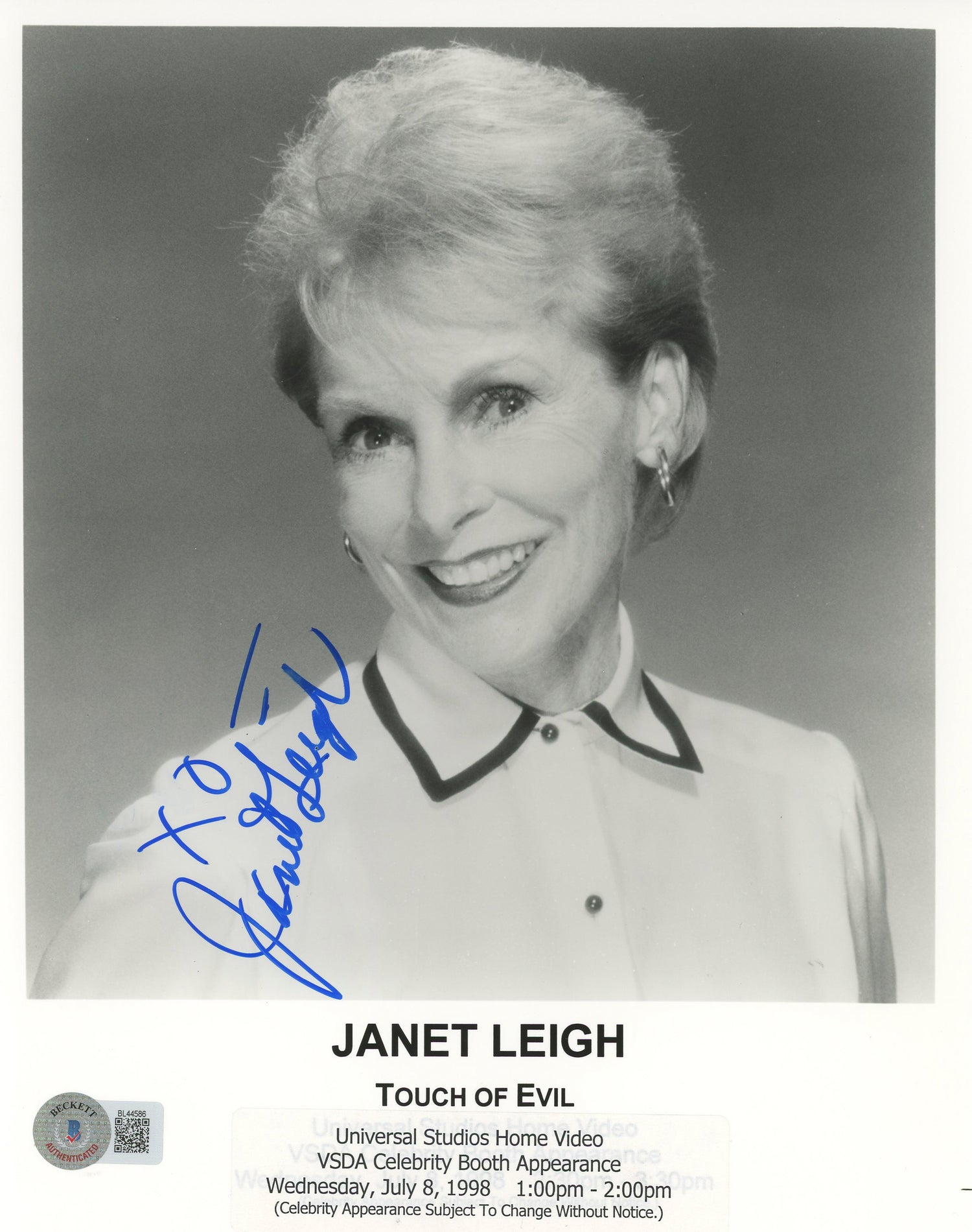 - Personally signed by Janet Leigh with the inscription "XO"