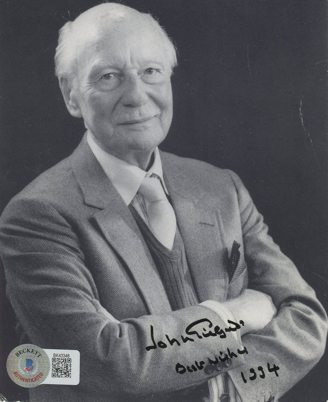 Own a rare piece of cinematic history with this John Gielgud autographed 4.75x6 photo, personally signed with the inscription "Best Wishes 1994." An Academy Award-winning actor, Gielgud is best known for his legendary role in Arthur, making this a must-have collectible for film enthusiasts and memorabilia collectors alike.