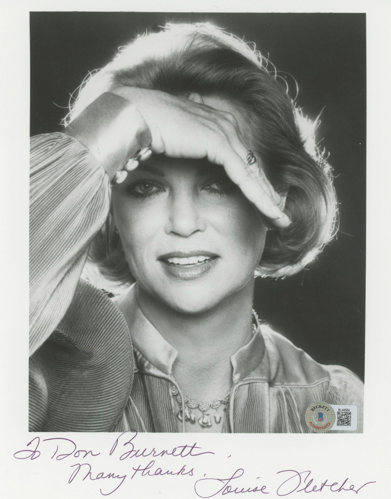 Own a rare piece of film history with this Louise Fletcher Autographed 8x10 Photo, featuring the personalized inscription "To Don Burnett, Many Thanks." Best known for her Academy Award-winning role as Nurse Ratched in One Flew Over the Cuckoo's Nest, Fletcher's autograph is a must-have for any dedicated collector of classic cinema memorabilia.