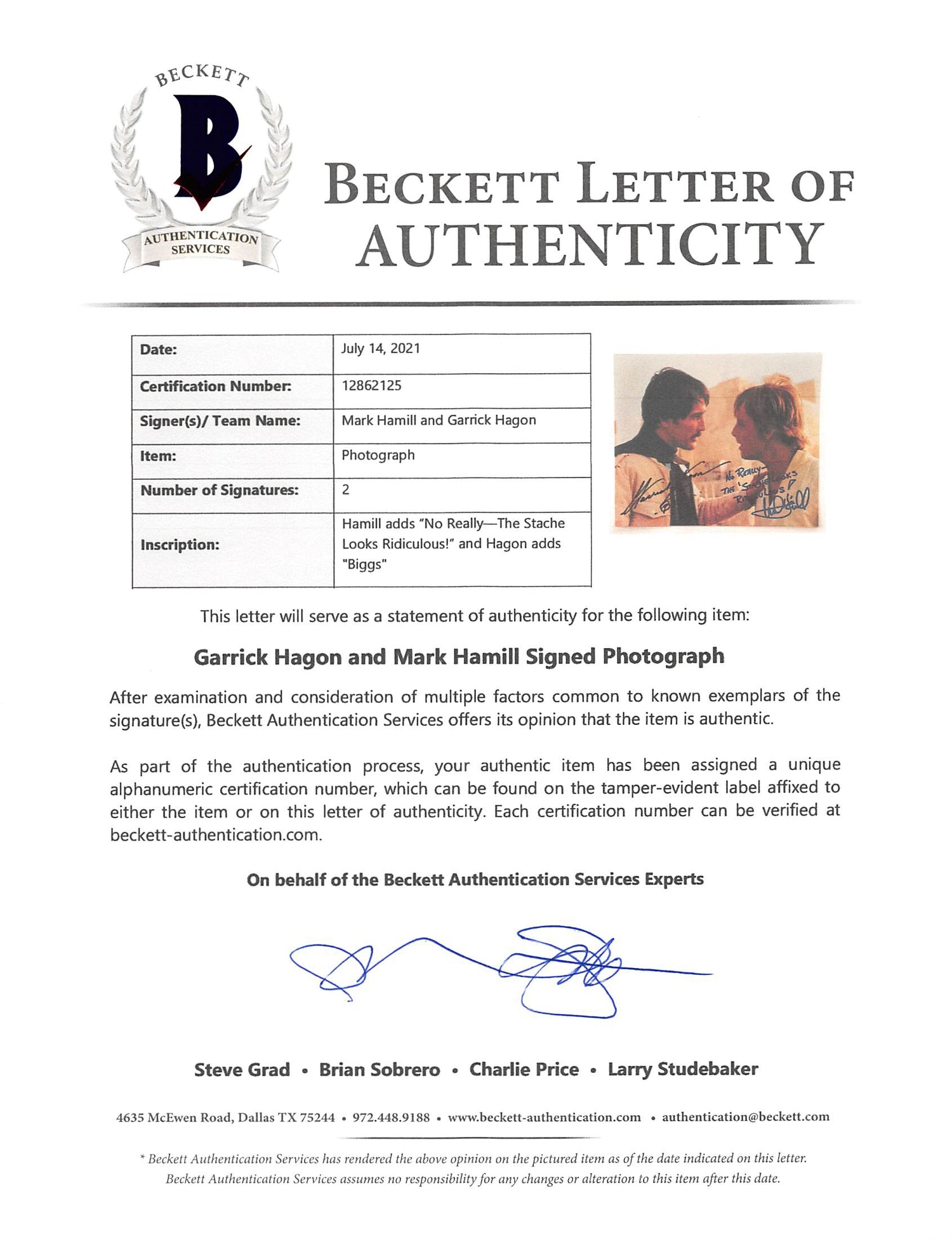• Authentic Signatures – Hand-signed by Mark Hamill (Luke Skywalker) and Garrick Hagon (Biggs Darklighter), two beloved characters from Star Wars: A New Hope.