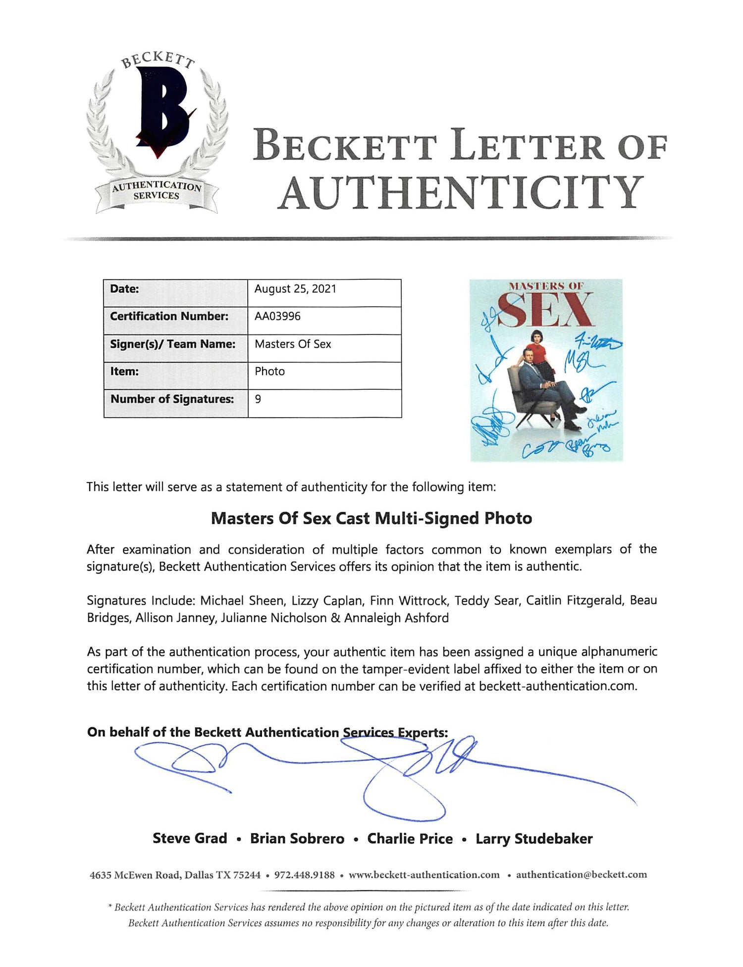 Masters of Sex (9) Sheen, Caplan, Bridges, Janney +5 Signed 11x14 Photo BAS is backordered and will ship as soon as it is back in stock.