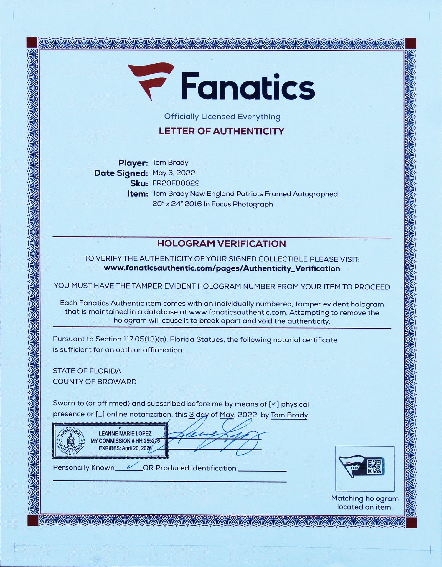 Elevate your collection with this Autographed 20x24 "In Focus" Framed Photo personally signed by legendary quarterback Tom Brady during his historic tenure with the New England Patriots. A must-have for passionate football fans and memorabilia collectors, this stunning piece is professionally framed and authenticated by Fanatics, ensuring its legitimacy and value.