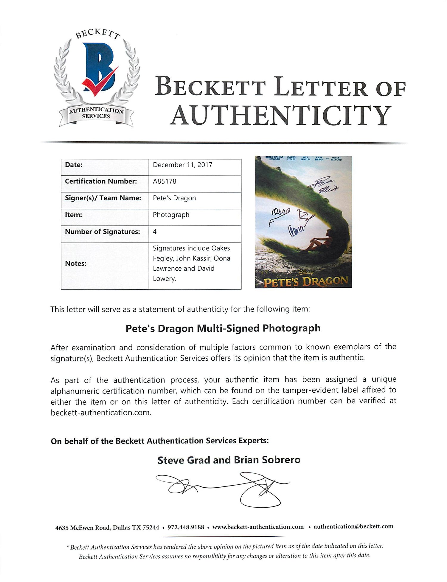 Celebrate the magic of Disney’s *Pete’s Dragon* with this Autographed 11x14 Photo, personally signed by Oakes Fegley, John Kassir, Oona Lawrence, and David Lowery. This exclusive collectible is a must-have for fans of the beloved film, making it a prime addition to any memorabilia collection.