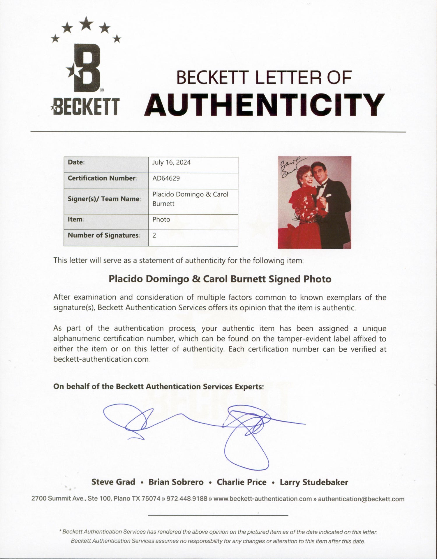 - Authentic Signatures – Hand-signed by Placido Domingo and Carol Burnett for a genuine collector’s item.