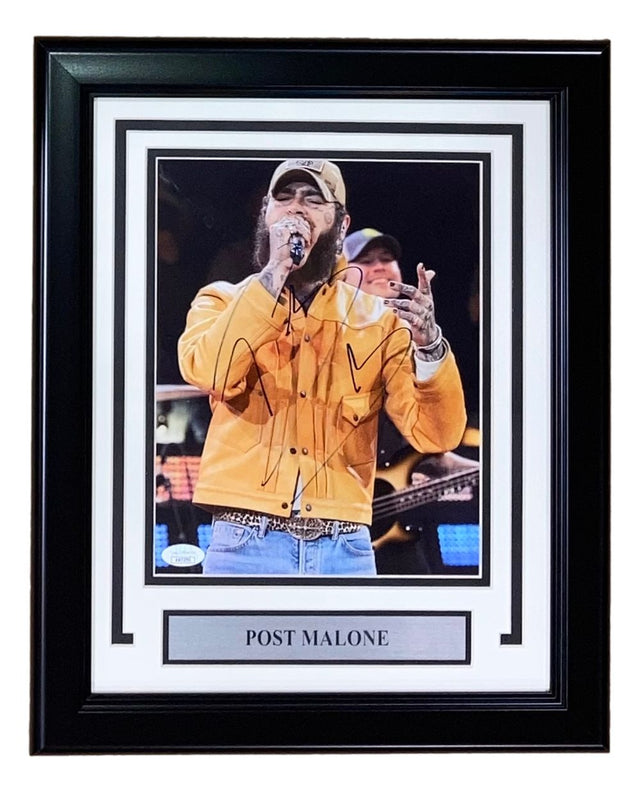 Add a slice of contemporary pop culture to your collection with this authentic Post Malone signed 8x10 photo. Known for his genre-blending music and chart-topping hits, Post Malone has quickly become one of the most influential artists of his generation. This autographed photo is a must-have for fans and collectors of modern music memorabilia. It comes professionally framed and matted to approximately 11x14 inches, making it ready to display right out of the box. Verified with a JSA (James Spence Authentication) hologram, this piece offers peace of mind with industry-standard authentication. Whether you're a lifelong fan or curating your collection of entertainment legends, this signed photo is a standout tribute to Post Malone’s impact on pop culture.