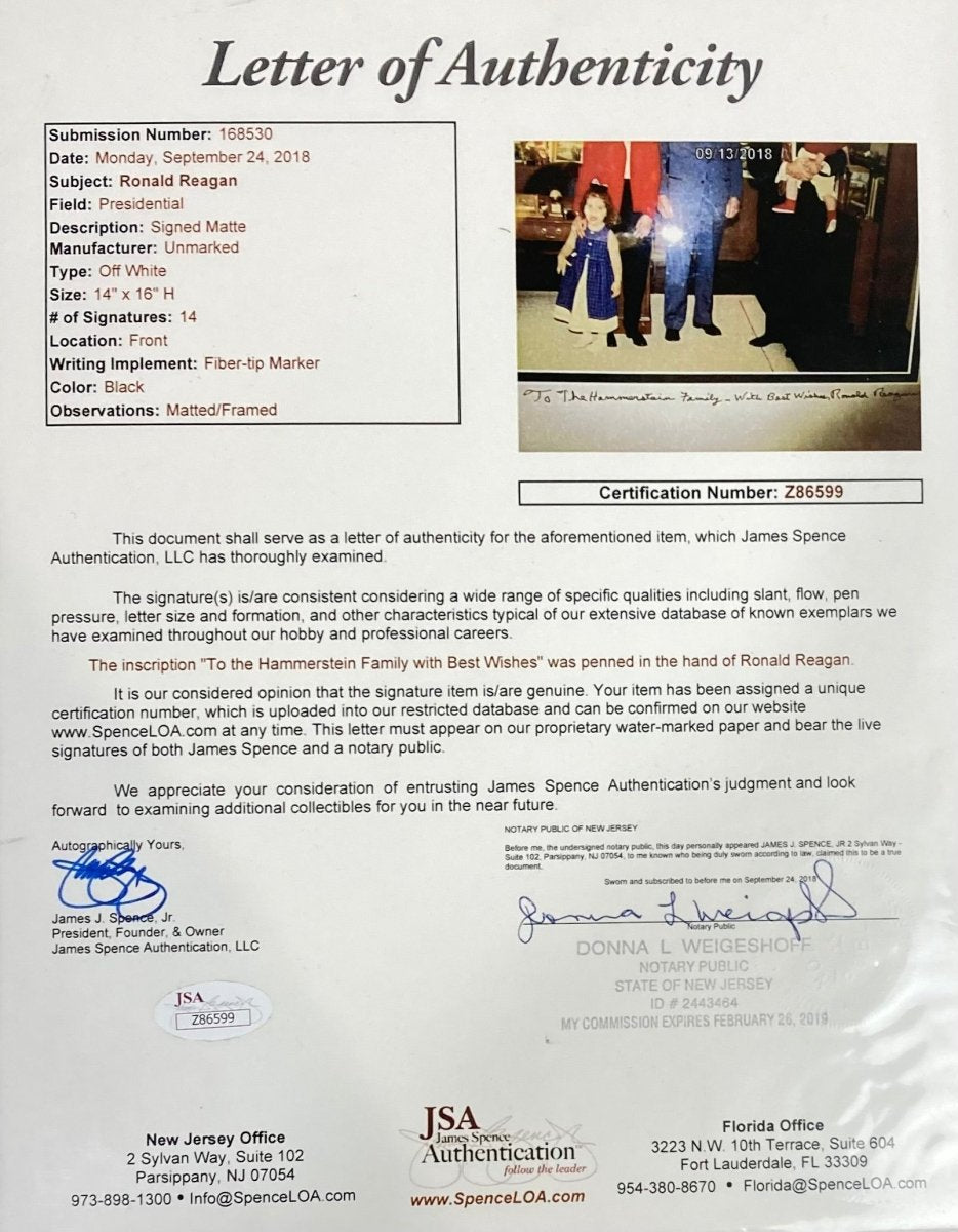 Own a piece of American history with this Ronald Reagan signed photo matte, a must-have for political collectors and memorabilia enthusiasts. This stunning 16x20 framed display features a genuine hand-signed autograph from Ronald Reagan, the 40th President of the United States, making it a unique addition to any collection. Authenticated by JSA (James Spence Authentication), this piece guarantees authenticity and lasting value.
