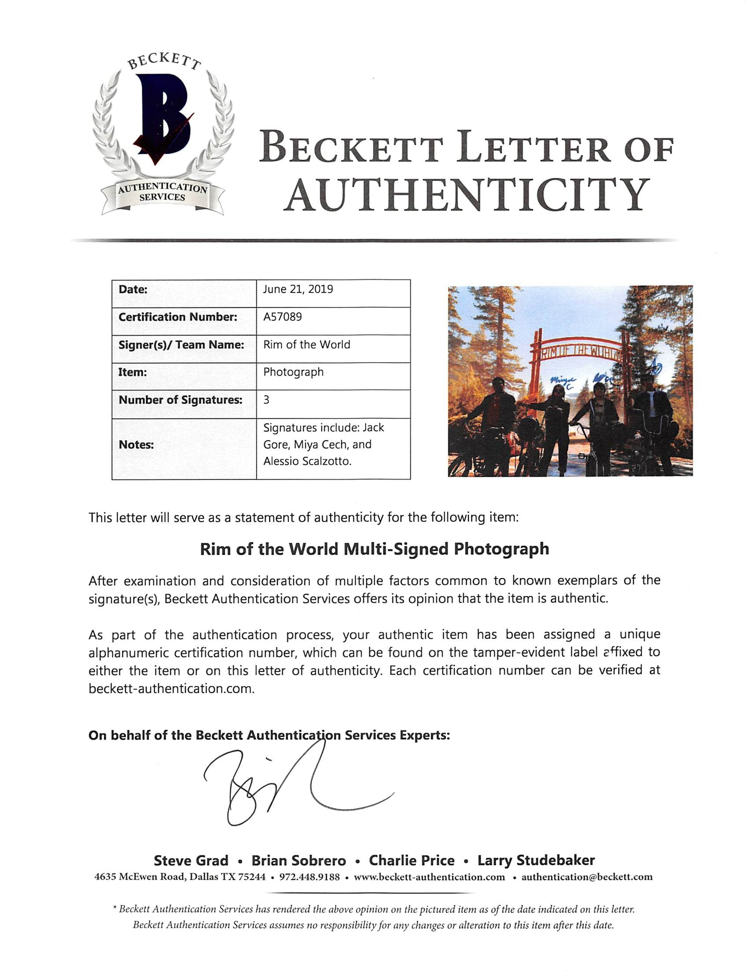 Rim Of The World (3) Gore, Cech & Scalzotto Signed 11x14 Photo BAS #A57089