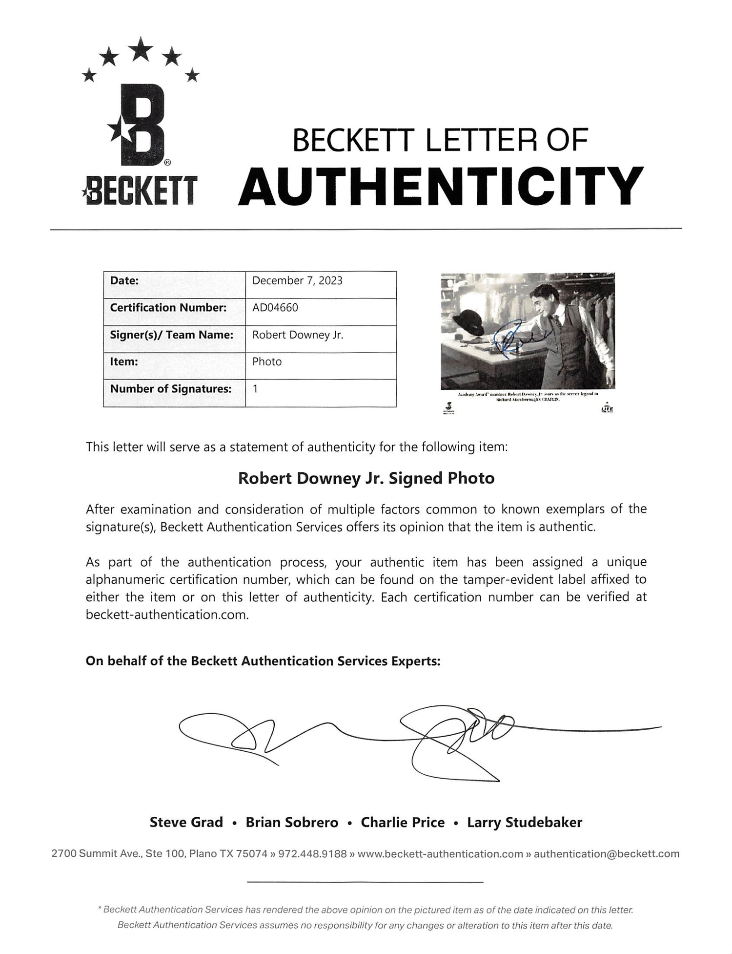 This officially authenticated collectible is a must-have for fans of Robert Downey Jr. and classic Hollywood cinema. Add this signed photo to your collection today before it's gone!