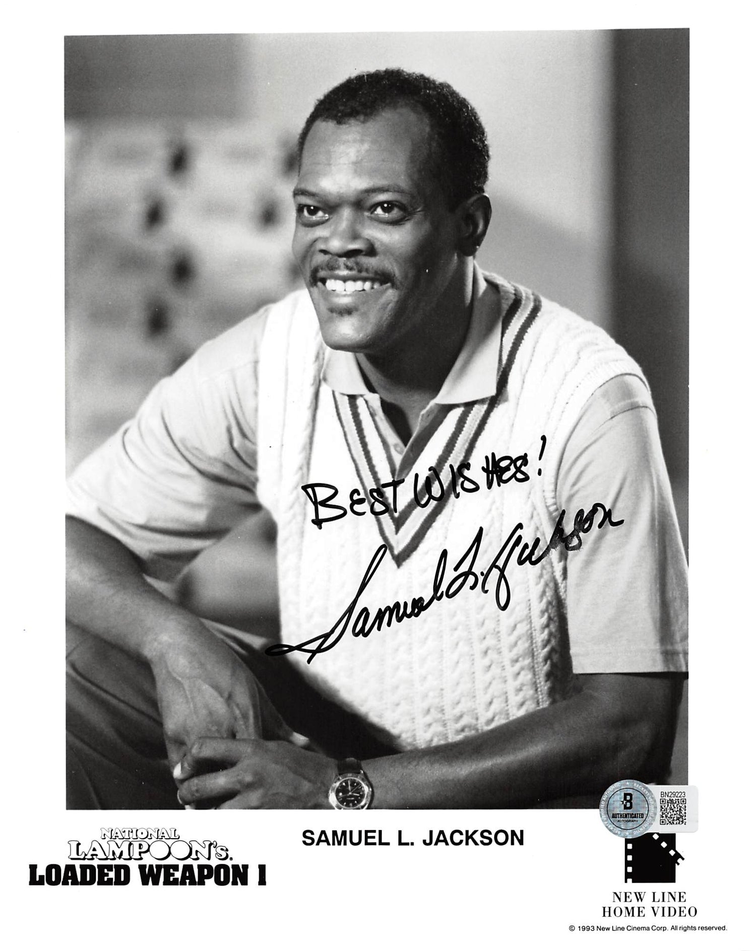 Own a piece of pop culture history with this Autographed 8x10 Photo personally signed by Samuel L. Jackson from the cult classic National Lampoon's Loaded Weapon 1. This exclusive collectible captures an iconic moment and includes the inscription "Best Wishes!", making it a must-have for fans and collectors alike.