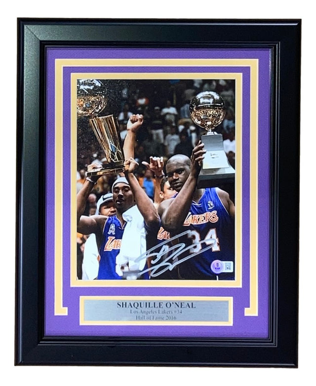 Celebrate the legacy of an NBA legend with this Shaquille O'Neal signed 8x10 Los Angeles Lakers photo, a must-have for any serious basketball memorabilia collection. Hand signed by the Hall of Famer himself, this iconic photo captures O'Neal during his dominant years with the Lakers, where he helped lead the team to three consecutive championships from 2000 to 2002. Professionally framed and matted to approximately 11x14 inches, this collector’s item is ready to display and sure to impress. Authenticated with a Beckett hologram and certificate of authenticity, this piece offers both visual appeal and verification of its value and authenticity.