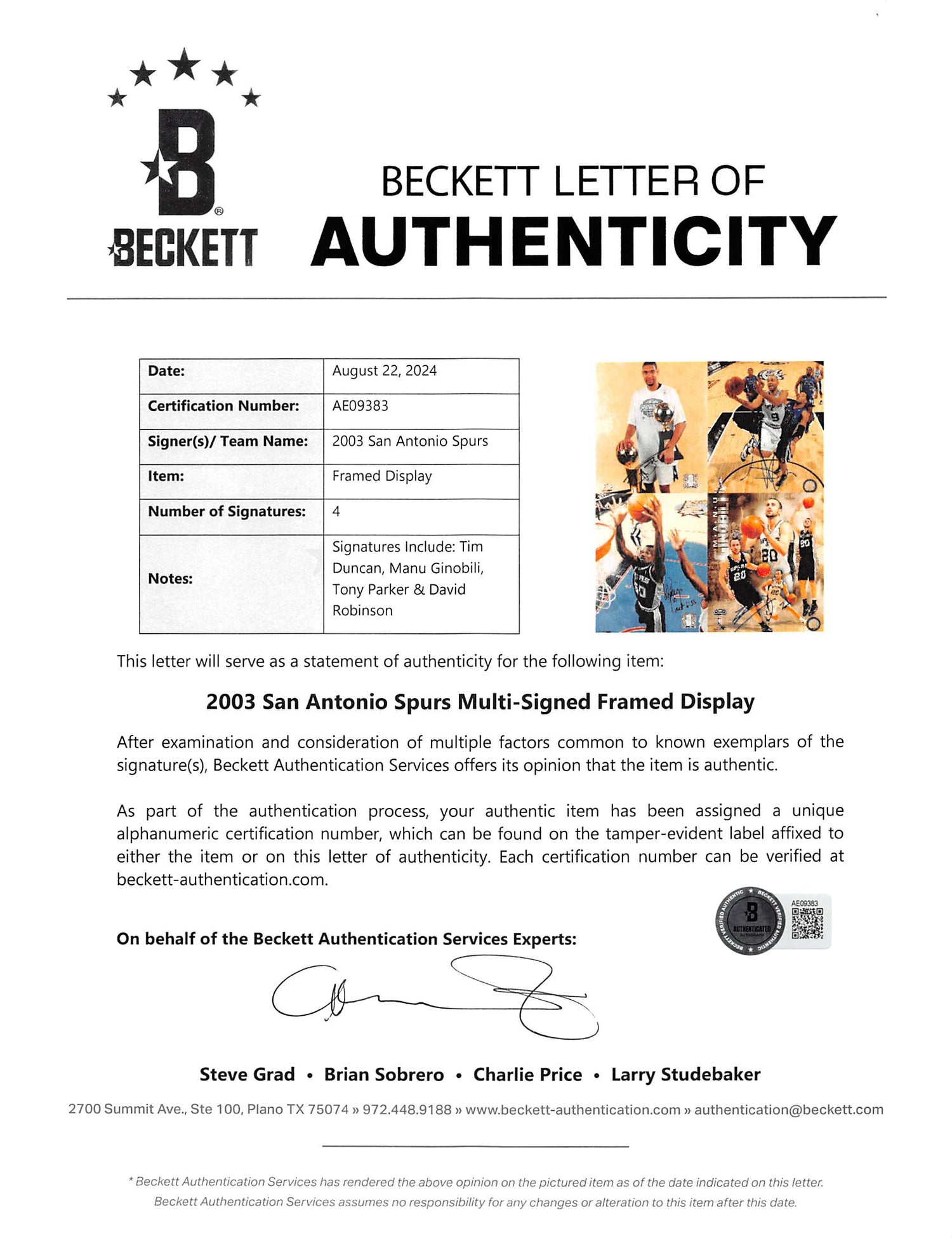 Spurs (4) Duncan, Robinson, Parker & Ginobili Signed & Framed 8x10 Photos BAS is backordered and will ship as soon as it is back in stock.