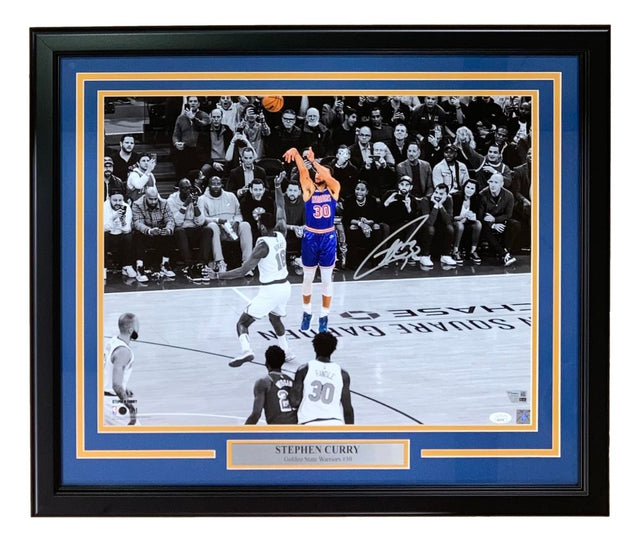 Celebrate basketball greatness with this Stephen Curry signed 16x20 Golden State Warriors photo—a must-have collectible for any serious NBA memorabilia fan. Widely regarded as one of the greatest shooters in NBA history, Stephen Curry has revolutionized the game with his deep range and clutch performances, leading the Golden State Warriors to multiple championships. This stunning photograph captures Curry in action and comes professionally framed and matted, adding a premium display-ready finish to your collection.