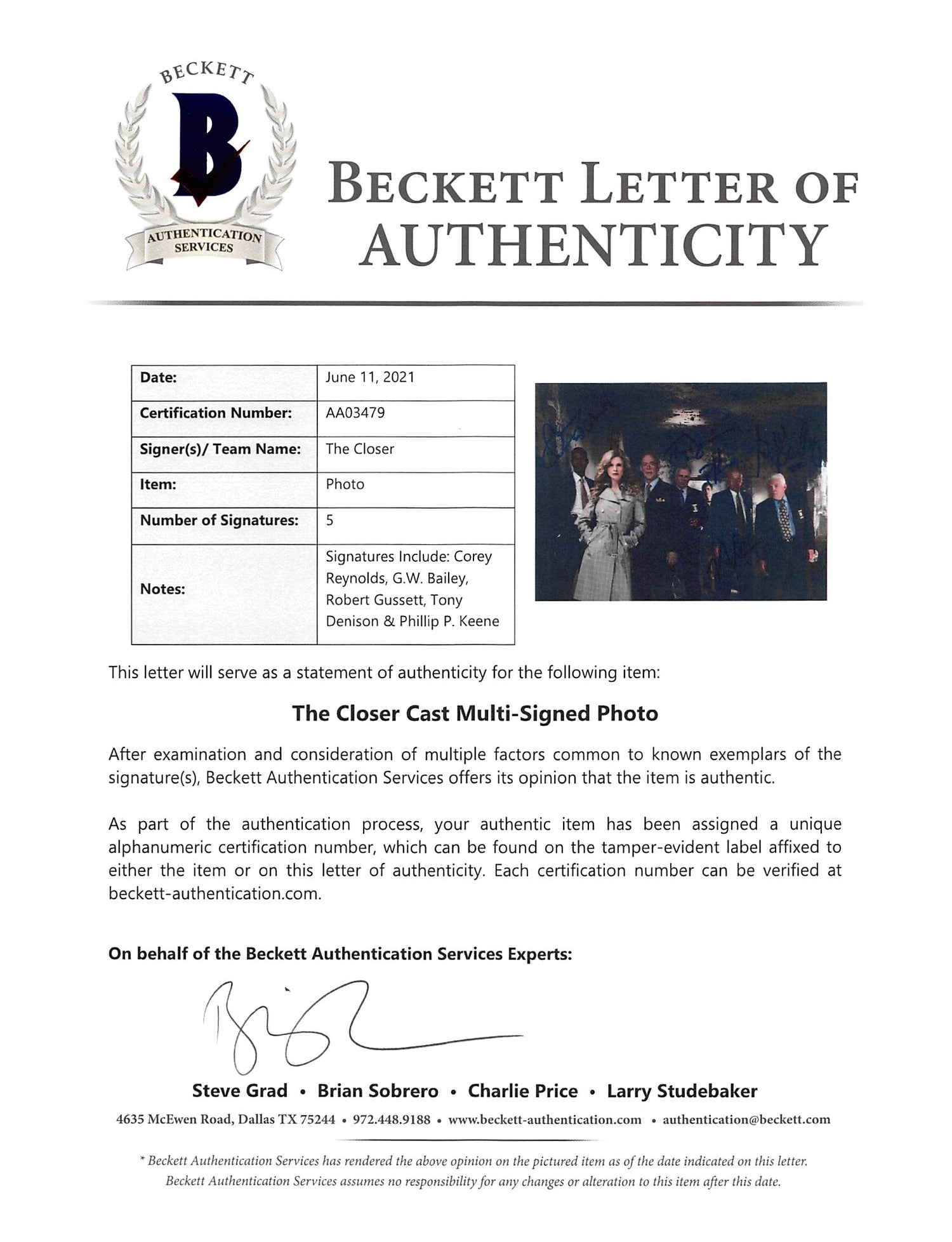 The Closer (5) Reynolds, Bailey, Gussett, Denison & +1 Signed 11x14 Photo BAS 3