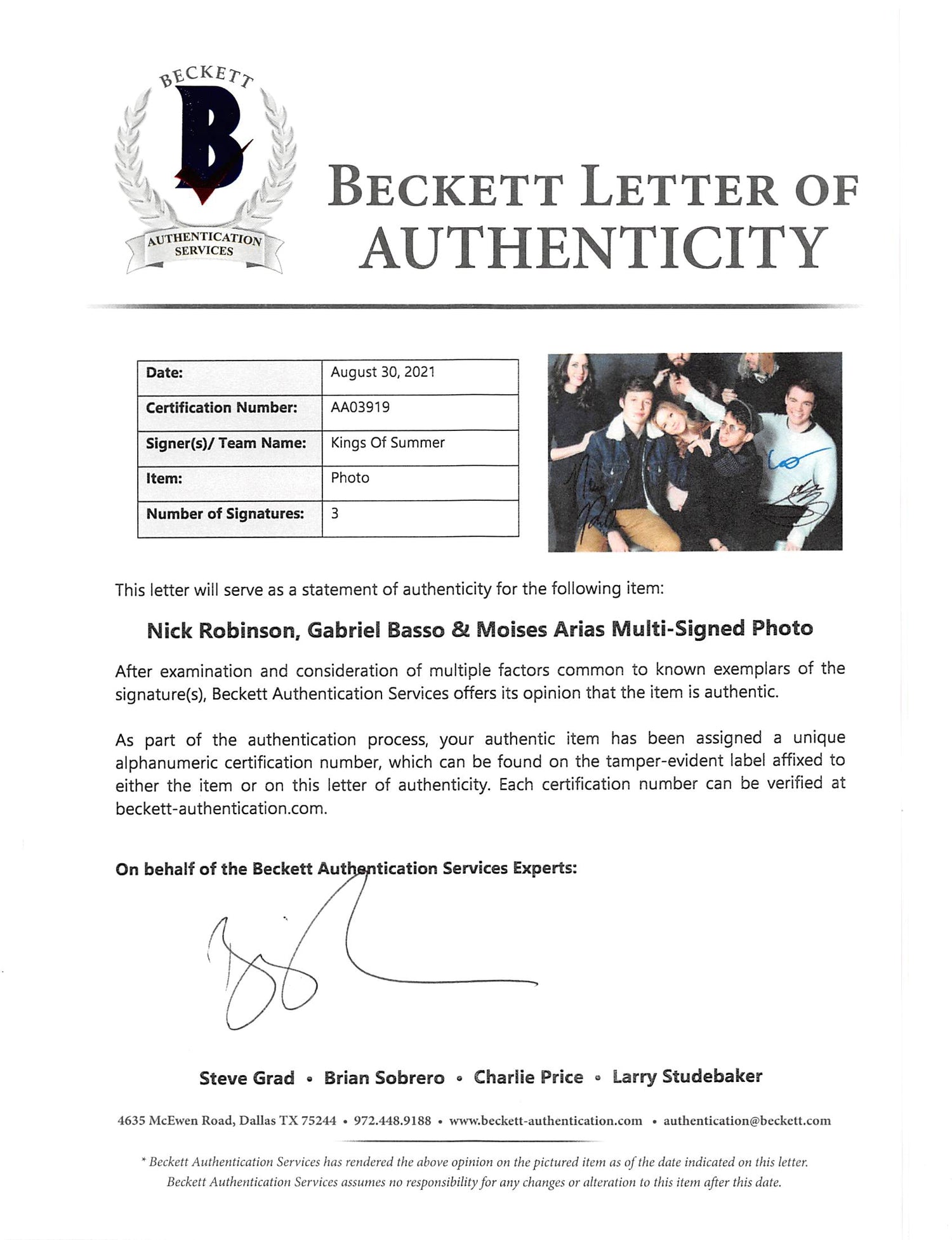 The Kings of Summer (3) Robinson, Basso & Arias Signed 11x14 Photo BAS #AA03919