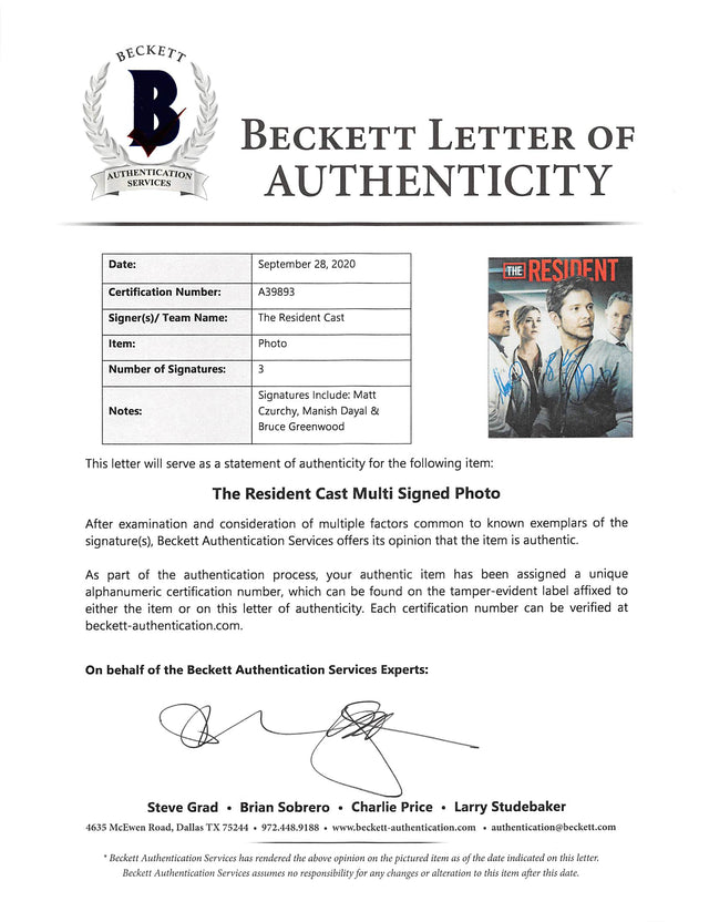 - Authentic Signature – Hand-signed by Matt Czuchry, Manish Dayal, and Bruce Greenwood of The Resident.
