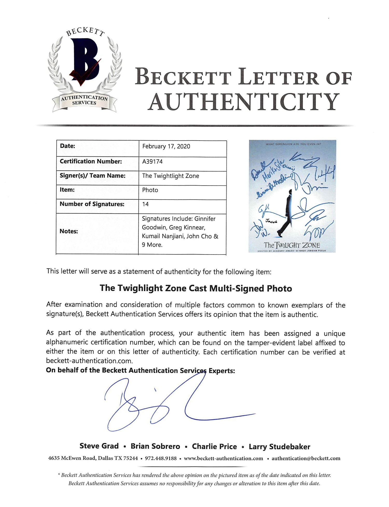 Own a piece of television history with this autographed 11x14 photo signed by the talented cast of The Twilight Zone. This rare collectible features authentic signatures from Ginnifer Goodwin, Jacob Tremblay, Greg Kinnear, James Frain, DeWanda Wise, Kumail Nanjiani, Markia Sila, Diarra Kilpatrick, John Cho, Ian Rosenfeld, Luke Kirby, Zabryna Guevara, Erica Tremblay, and one additional cast member. A must-have for fans of the iconic sci-fi anthology series.