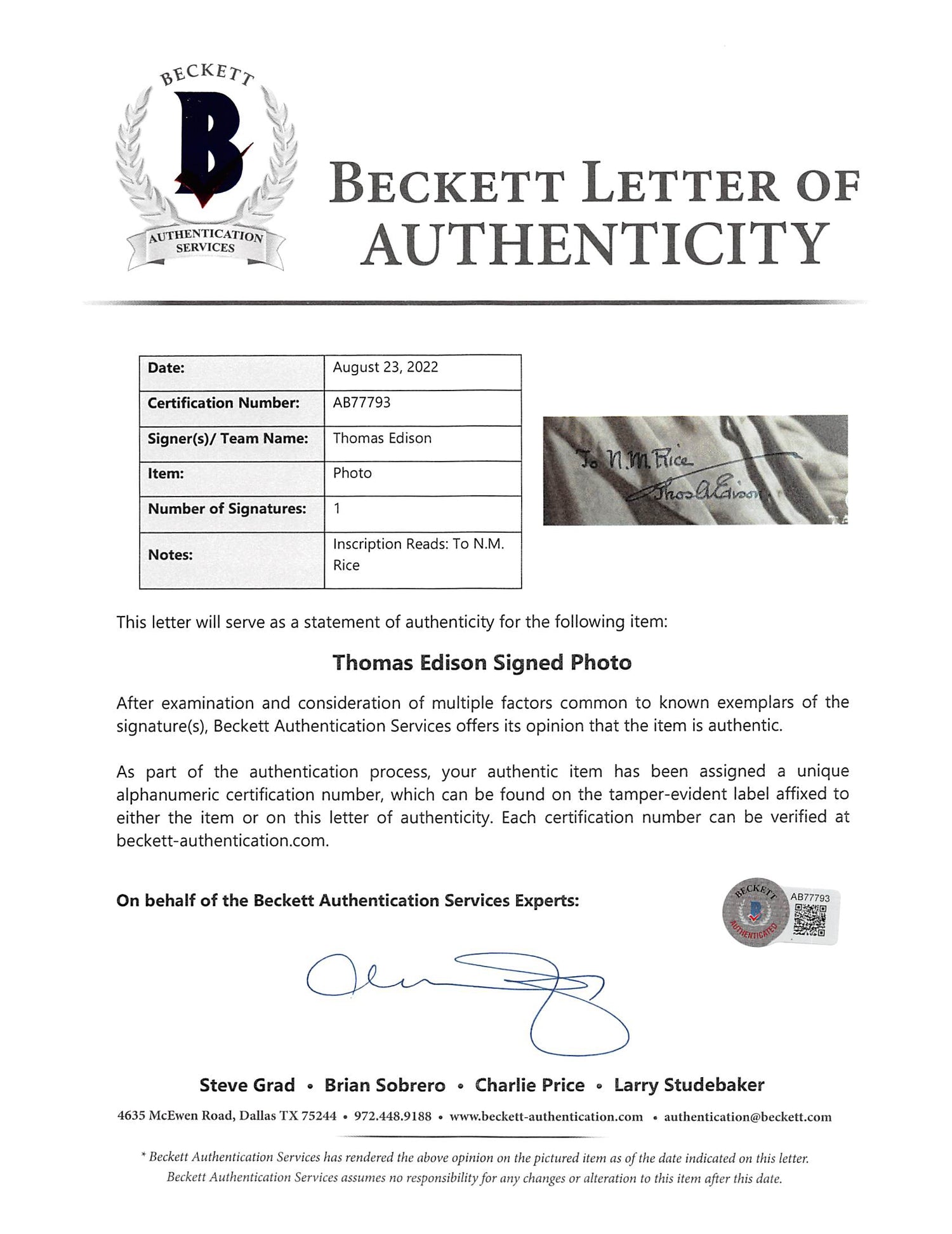 Thomas Edison To N.M. Rice Authentic Signed 8x10 Framed Photo BAS #AB77793 is backordered and will ship as soon as it is back in stock.