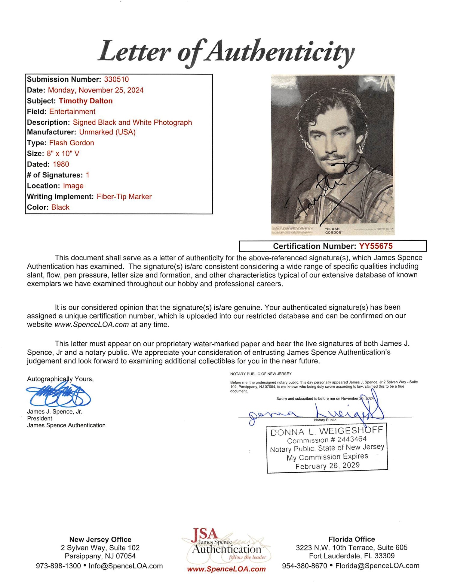 Celebrate the legacy of Flash Gordon and elevate your collection with this Timothy Dalton signed photo. Whether you're a dedicated sci-fi fan or a memorabilia investor, this authenticated collectible is a valuable addition to your display. Secure it today before it’s gone!
