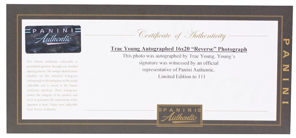 - Official Trae Young autograph – Certified by Panini Authentic with a tamper-proof hologram and COA card.