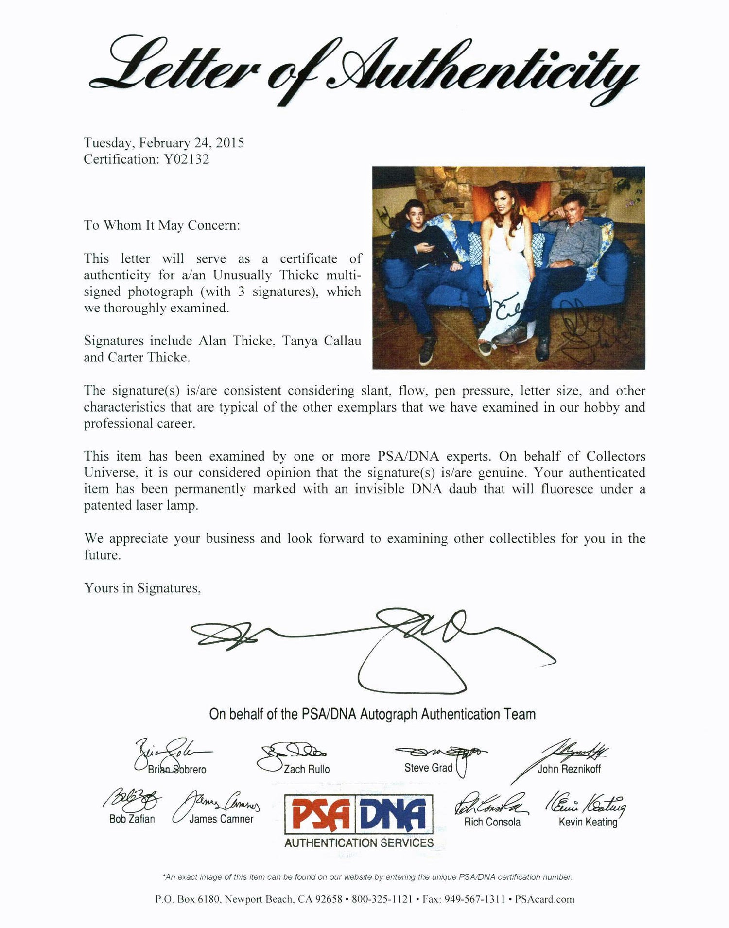 Unusually Thicke (Alan, Carter & Tanya Callau) Signed 8X10 Photo PSA/DNA #Y02132