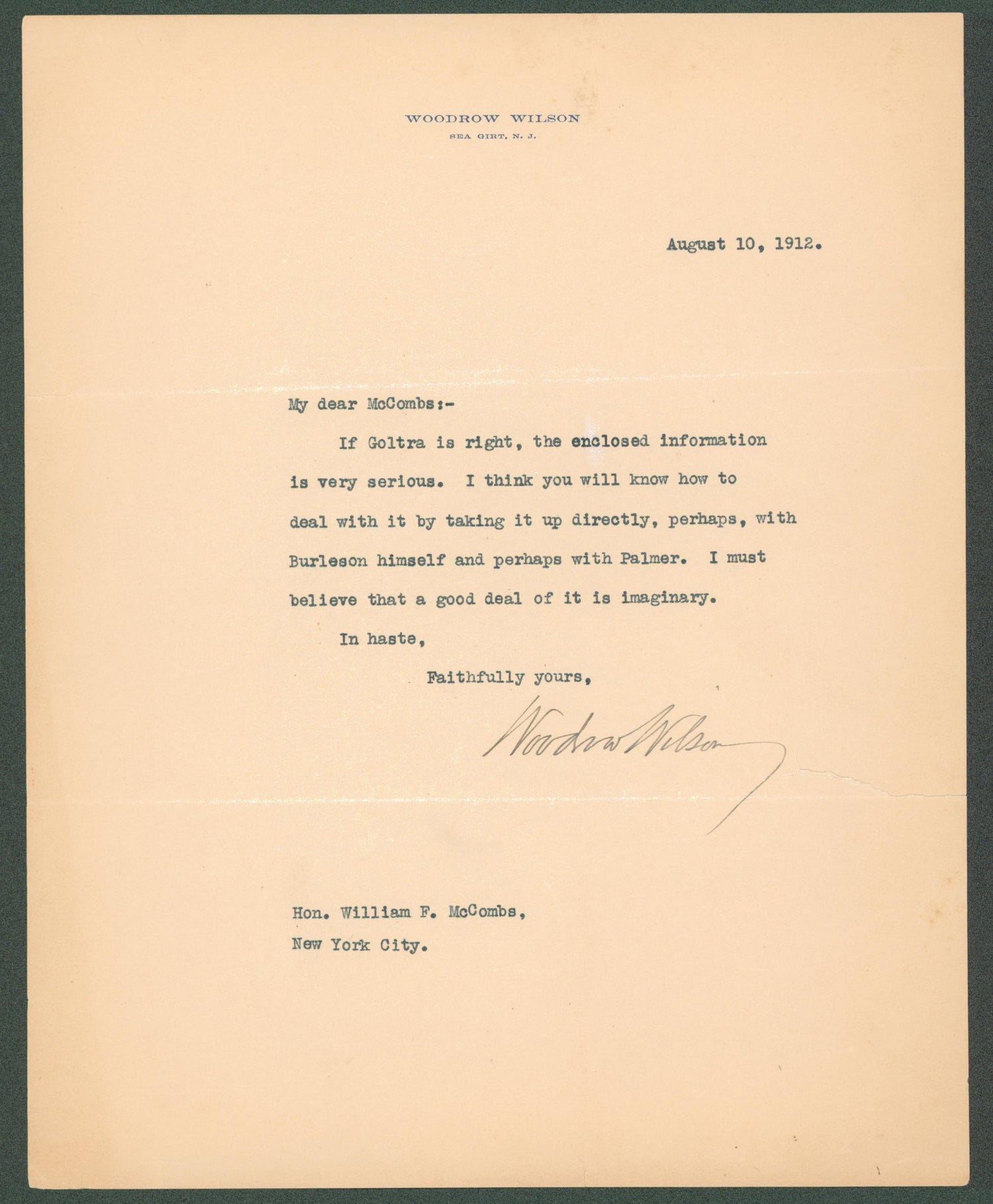 Woodrow Wilson Authentic Signed 8x10 Letter August 10, 1912 BAS #AB14551