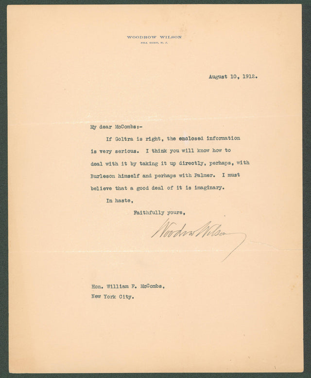 This Autographed August 10, 1912, 8x10 Letter is a rare and extraordinary piece of history, personally signed by Woodrow Wilson, the 28th President of the United States. This authenticated document offers collectors a unique opportunity to own a genuine signature from a pivotal leader known for guiding the nation through World War I and shaping modern American diplomacy.