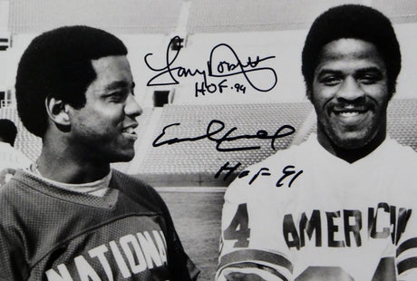 Tony Dorsett/Earl Campbell Autographed HOF 8x10 B&W Smiling Photo- Beckett Auth