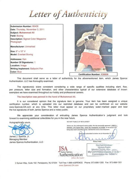 Muhammad Ali Authentic Triple Signed 8X10.5 Magazine Page Photo JSA #X35536
