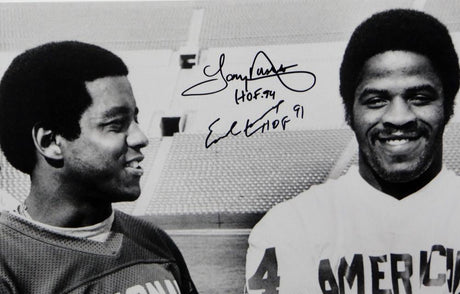 Tony Dorsett/Earl Campbell Autographed HOF 8x10 B&W Smiling Photo- Beckett Auth