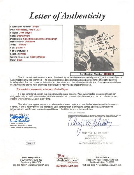 John Wayne True Grit "Good Luck" Authentic Signed 8x10 B&W Photo JSA #BB39621