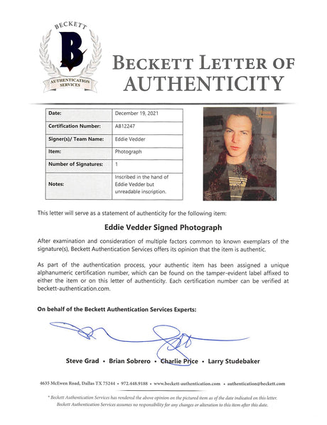 Eddie Vedder Pearl Jam Authentic Signed 11x14 Photo Autographed BAS #AB12247