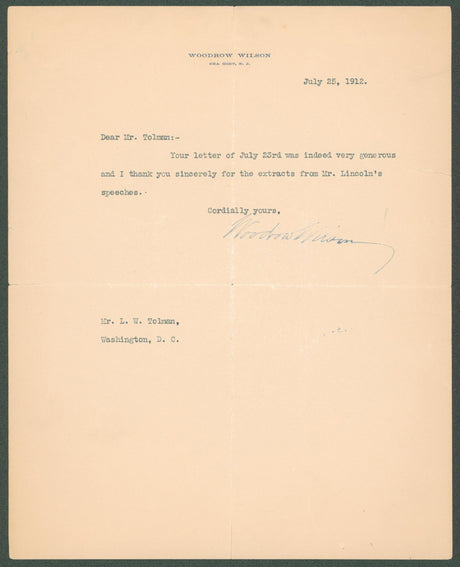 Woodrow Wilson Authentic Signed 8x10 Letter Dated July 25, 1912 BAS #AB14552