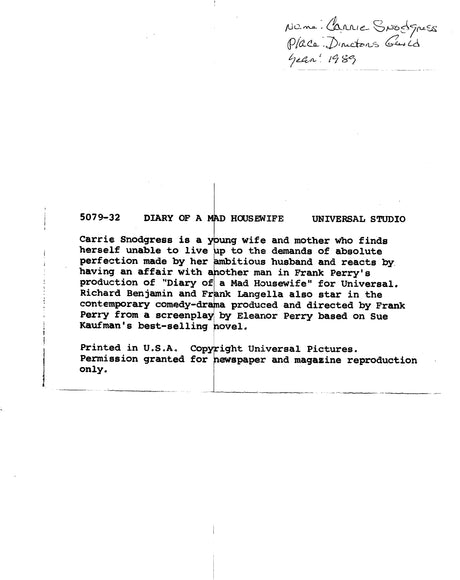 Carrie Snodgress Diary of a Mad Housewife Signed 8x10 Photo BAS #BN29113