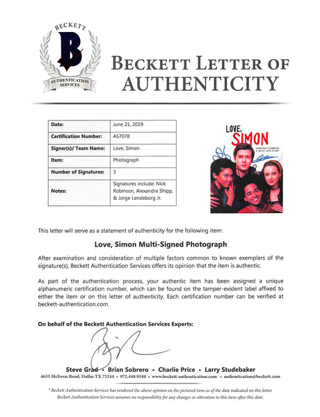 Love, Simon (3) Nick Robinson, Shipp, & Lendeborg Signed 8x10 Photo BAS #A57078