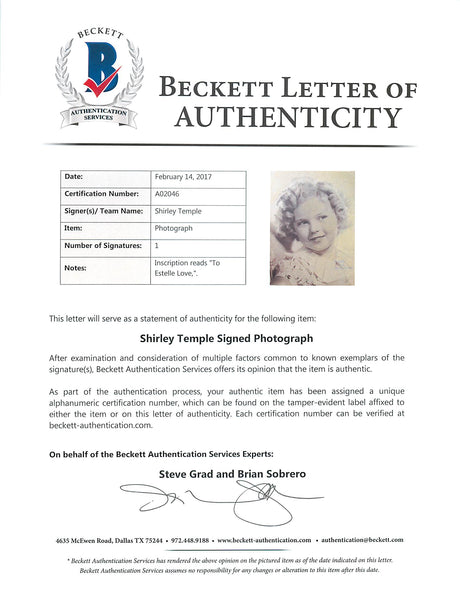 Shirley Temple "To Estelle Love" Authentic Signed 11X14 Sepia Photo BAS #A02046