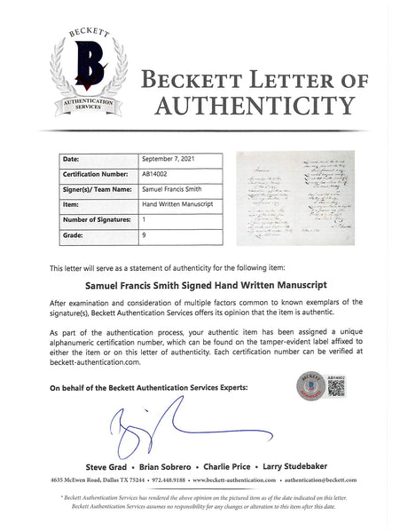 Samuel Francis Smith Signed 8x10 Hand Written Poem Auto Graded 9! BAS #AB14002