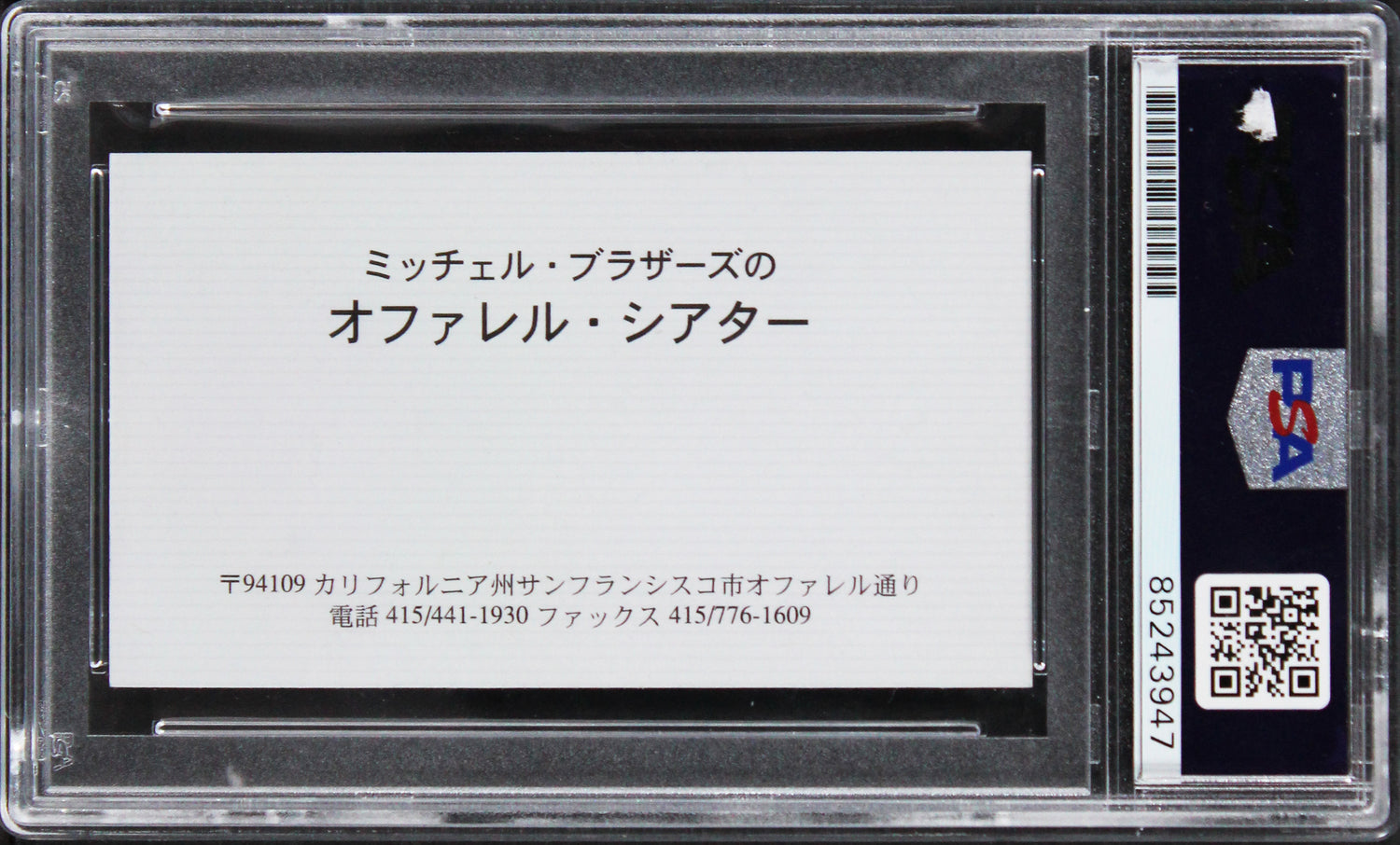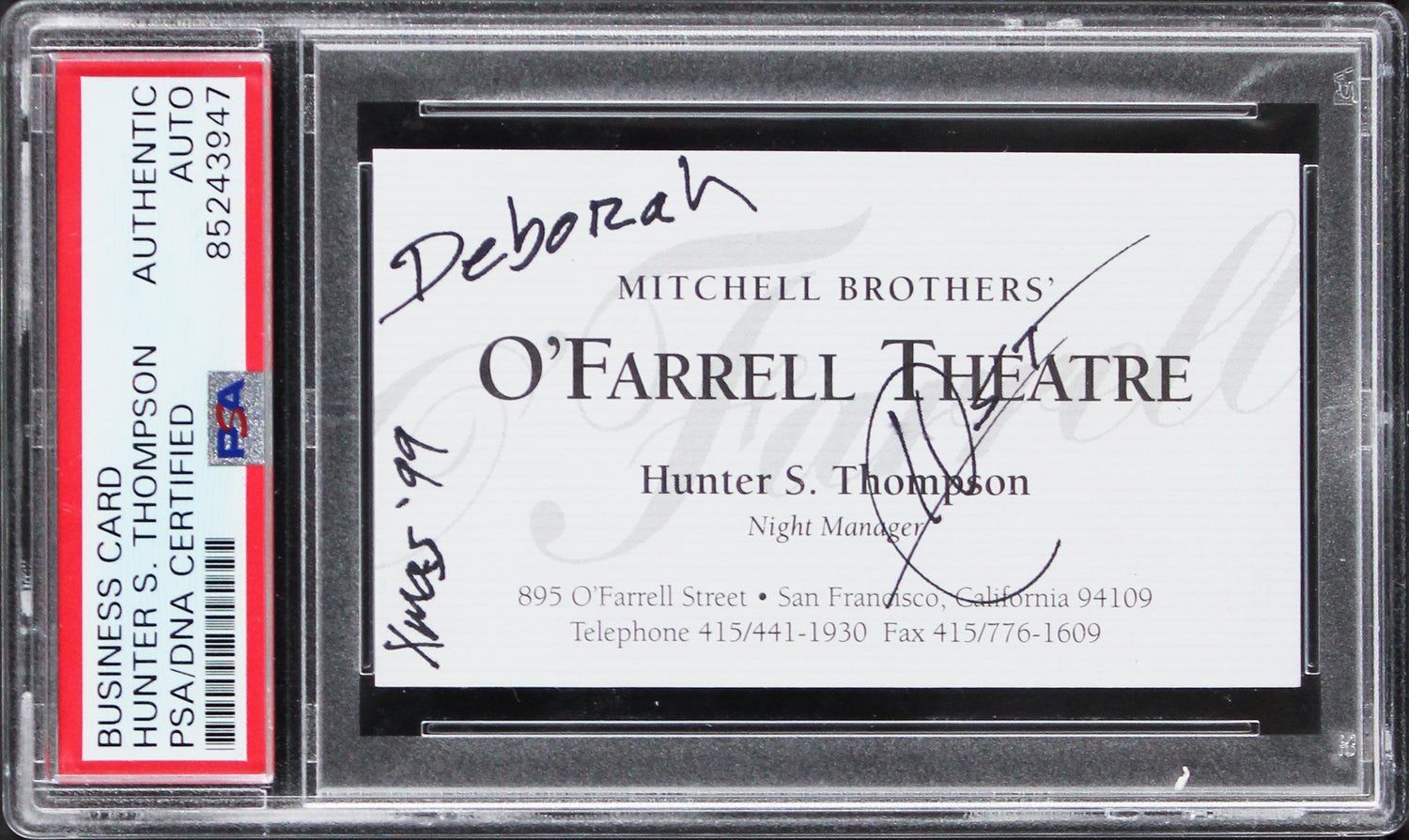 Own a rare piece of counterculture history with this Autographed Night Manager Mitchell Brothers' O'Farrell Theatre Business Card, personally signed by the legendary Hunter S. Thompson, the famed author of Fear and Loathing in Las Vegas. This unique artifact features a personal inscription reading "Deborah Xmas '99", offering collectors an intimate connection to one of the most iconic figures in American literature and journalism. Known for his groundbreaking work in Gonzo journalism and his deep ties with the 1960s and 70s counterculture, Thompson's signature is highly sought-after, especially on items tied to his life and experiences in San Francisco's vibrant underground scene. This piece is professionally authenticated and encapsulated by PSA/DNA, the industry leader in memorabilia certification, ensuring full authenticity and long-term preservation of this collectible.