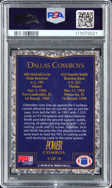 Emmitt Smith & Michael Irvin Signed 1992 Pro Set #5 PC Card 9! Auto 10! PSA Slab