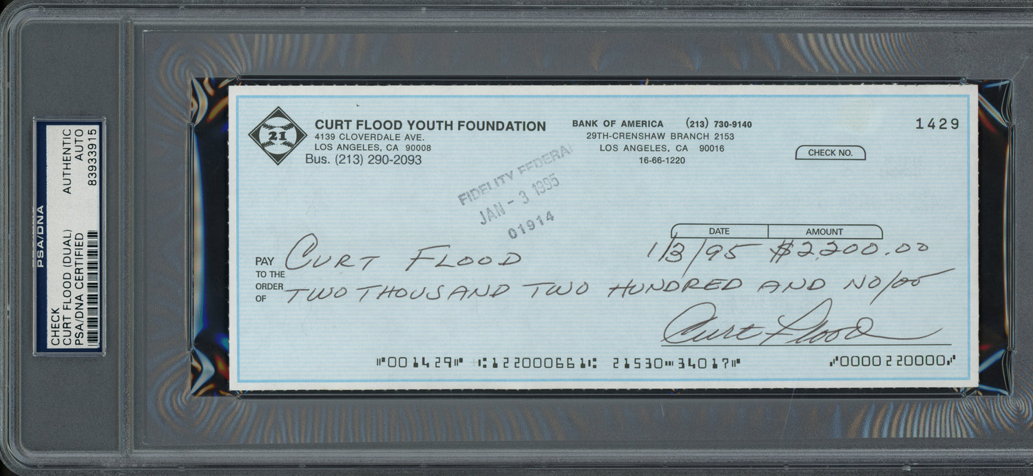 - Authentic hand-signed check by Curt Flood — Flood signed this item twice, making it exceptionally unique.