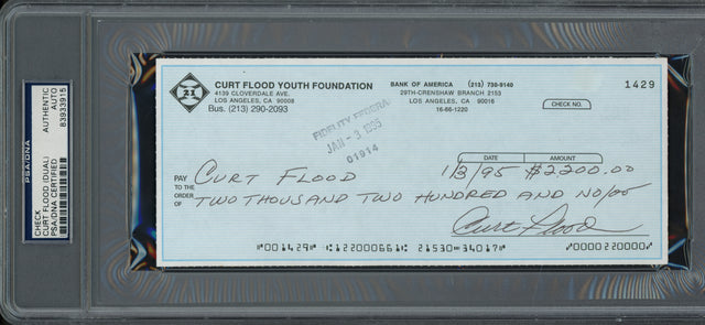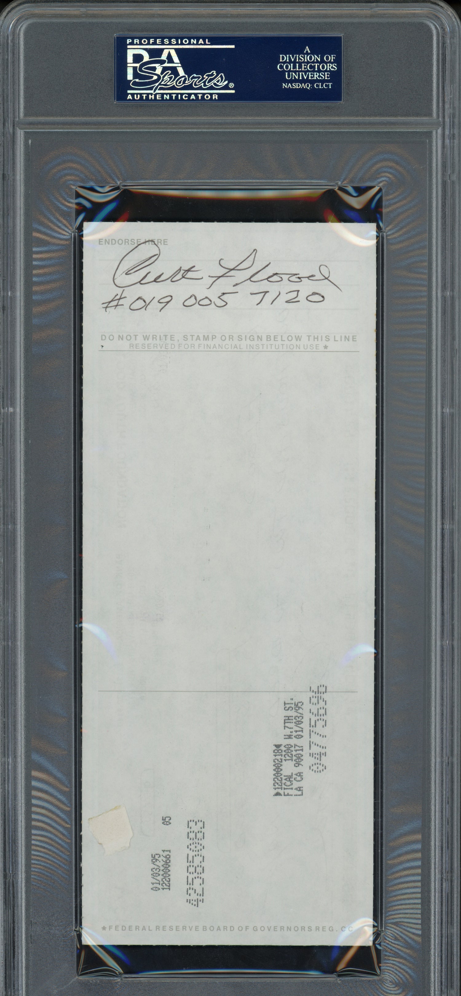 Curt Flood Autographed 3.5x8.5 Check St. Louis Cardinals (Signed Twice) PSA/DNA #83933915