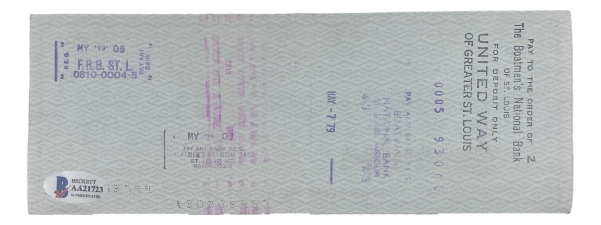 Own a rare piece of baseball history with this Stan Musial St. Louis Cardinals signed bank check. A true treasure for collectors, this authentic check has been hand-signed by Stan Musial, one of the greatest hitters in Major League Baseball history. Musial, a Hall of Famer and 3-time MVP, left an enduring legacy with the St. Louis Cardinals, making this signed check a must-have for serious fans and memorabilia enthusiasts.