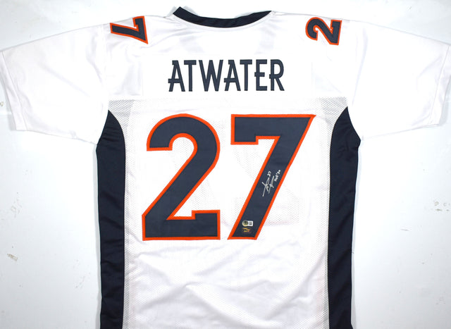 This is not an official NFL jersey—it has no logos, tags, or emblems—but it is a high-quality collectible featuring Atwater’s hand-signed autograph. The signature is Beckett Witness Authenticated, ensuring its authenticity with a numbered sticker hologram and a QR code for verification on the Beckett Authentication website.