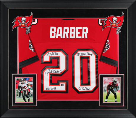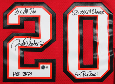 Buccaneers Ronde Barber "4x Insc" Signed Red M&N Throwback Framed Jersey BAS Wit
