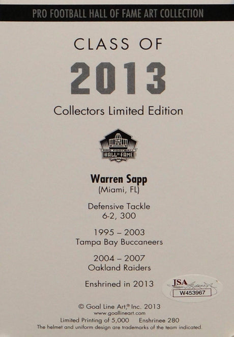 $149Unit price /Unavailable Warren Sapp HOF Autographed Tampa Bay Buccaneers Goal Line Art Card- JSA W Auth
